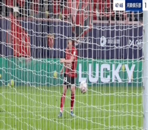 在中超第29轮,蓉城主场与河南队的比赛第15分钟,双方队员在河南队罚球区附近争抢头球后,裁判员判河南队周缘德手球犯规,随后蓉城国脚胡荷韬进球。