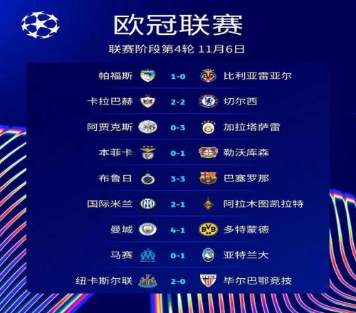 最终曼城4-1大胜多特,曼城4轮3胜1平不败,积10分暂居第4,多特7分第14。
